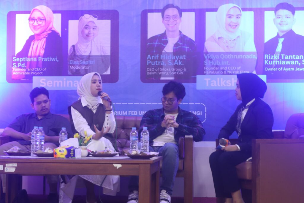 Setelah seminar, acara dilanjutkan dengan talkshow yang mengangkat tema mengenai entrepreunership dan personal branding serta pengalaman membangun dan mengelola bisnis. Pada acara talkshow ini, diisi oleh tiga orang pembicara yang bergelut di bidang bisnis dan personal branding yaitu kak Arif Hidayat Putra sebagai CEO of Siloka Group dan Bakmi Wong Soe Gih, lalu ada kak Vidya Qothrunnada, S.Hub.Int. Founder dan CEO of PaPa Burjo dan NuYok Pizza, dan yang terakhir ada kak Rizki Tantan Kurniawan, S.E. sebagai Owner of Ayam Jawara. Peserta sangat antusias mendengarkan dan berinteraksi dengan pembicara, banyak dari mereka yang mengajukan pertanyaan seputar strategi memulai usaha dan mengatasi hambatan. Diskusi ini sangat bermanfaat, karena memberikan wawasan praktis tentang dunia bisnis yang tidak selalu diajarkan di bangku kuliah. Harapannya, pengalaman pembicara dapat memotivasi anggota baru untuk berani mengambil langkah dalam berwirausaha.